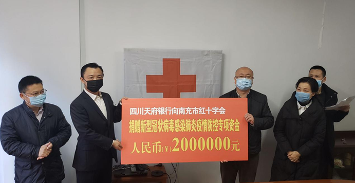 1月29日,四川天府银行通过南充市红十字会捐款200万元,专项用于南充新型冠状病毒感染肺炎疫情防控专所需医用耗材、防护用品等物资的采购。