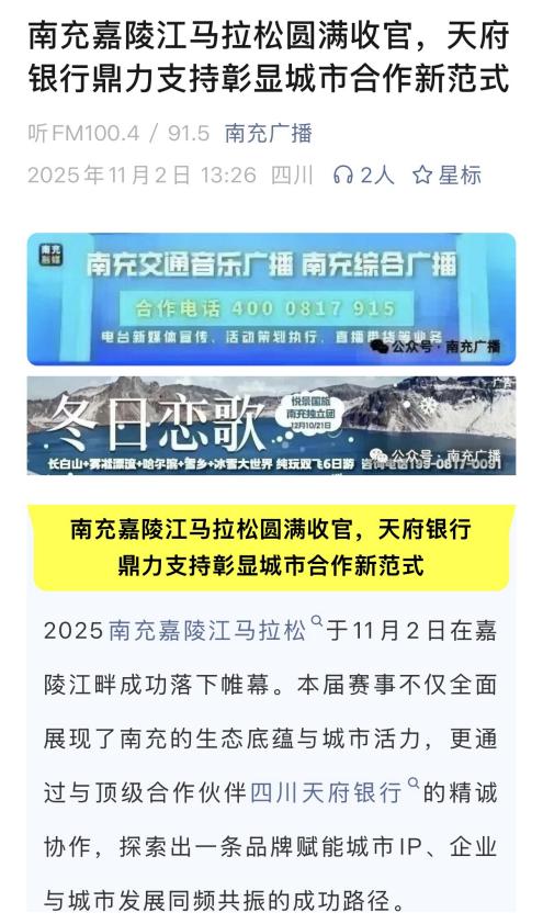 本次马拉松合作已圆满收官,但我行品牌奔跑的脚步从未停歇。通过这次高规格、深层次的品牌实践,我们不仅极大地提升了品牌影响力,更凝聚了银行员工的归属感与自豪感。赛后组委会及南充融媒均对我行此次活动进行深入报道及高度评价,让我们共同珍藏这份荣耀与激情,将其转化为服务客户、推动发展的不竭动力,继续在高质量发展的赛道上,跑出四川天府银行的加速度!